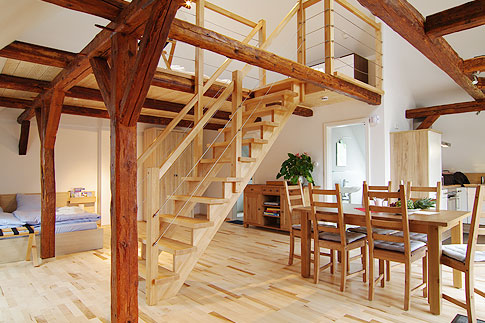 Der offene Wohn-, Schlaf- und Essbereich mit der Treppe zur Galerie