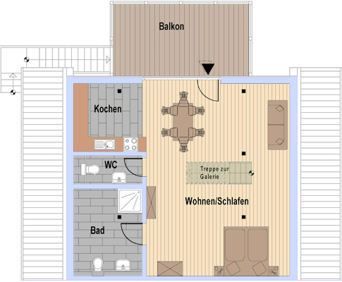 Diese wunderschöne, großzügige 75 m²-Wohnung zzgl. 16 m² Balkon erstreckt sich auf 2 Ebenen. In der oberen, offenen Galerie befindet sich 1 Doppelbett mit einem großzügigen Platzangebot. Auf der unteren Ebene findet sich neben einem zweiten Doppelbett eine Wohlfühloase mit Flachbild TV für das entspannte Abendprogramm und einem freien WLAN, über das Sie Ihre Impressionen des Tages mit Freunden teilen können. Ein freundlich, modern eingerichtetes Badezimmer und ein separates WC erleichtern den Start in den Tag. Eine komplett ausgestattete Wohnküche mit Ceranfeld, Backofen, Kaffeemaschine, Toaster und Spülmaschine lässt keine Wünsche offen. Hier können Sie ihr eigenes Frühstück zubereiten oder aber abends gemeinsam kochen. Die Südwohnung ist durch einen separaten Eingang über einen großzügigen Balkon zugänglich.